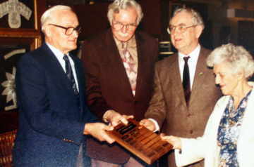 In this picture Society President Leslie Eggleton is presenting a plaque to show the Society's appreciation for the donation of photograph collections. The donations included three extensive collections that were donated to the archives in 1982. Mr. Hastings, former publisher of the Surrey-Delta Messenger and photographer for White Rock Sun; Mr. McKinnon, former editor of The Surrey Leader; Mr. Curtis, former photographer for the Surrey Leader and later for the Langley Advance, donated their negatives and prints. Mrs. Amanda Curtis, wife of Neville Curtis, is accepting the plaque along with Bill Hastings and Stan McKinnon,